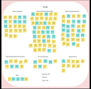 The project manager of SBA Certify tasked me with going through the tickets on the SBA helpdesk and organizing user feedback. I was asked to synthesize hundreds of individual tickets into a clear visual or document that highlights key issues and supports actionable recommendations. I utilized an affinity diagram because they provide a concise snapshot of information gathered from many points of data. I began by doing through the helpdesk ticket by ticket and providing a brief explanation of the issue described on a sticky note.
