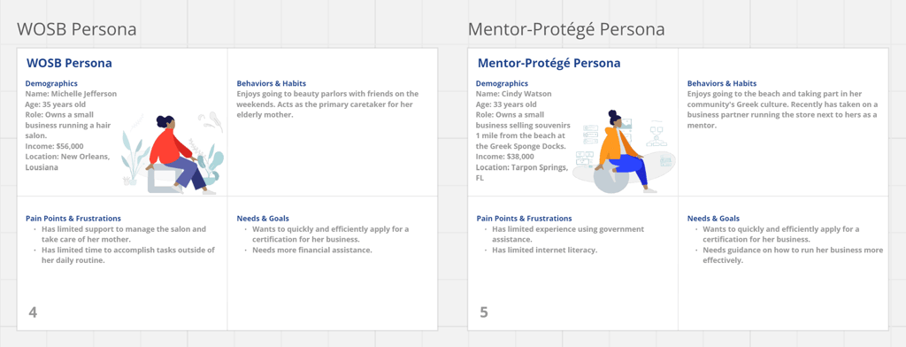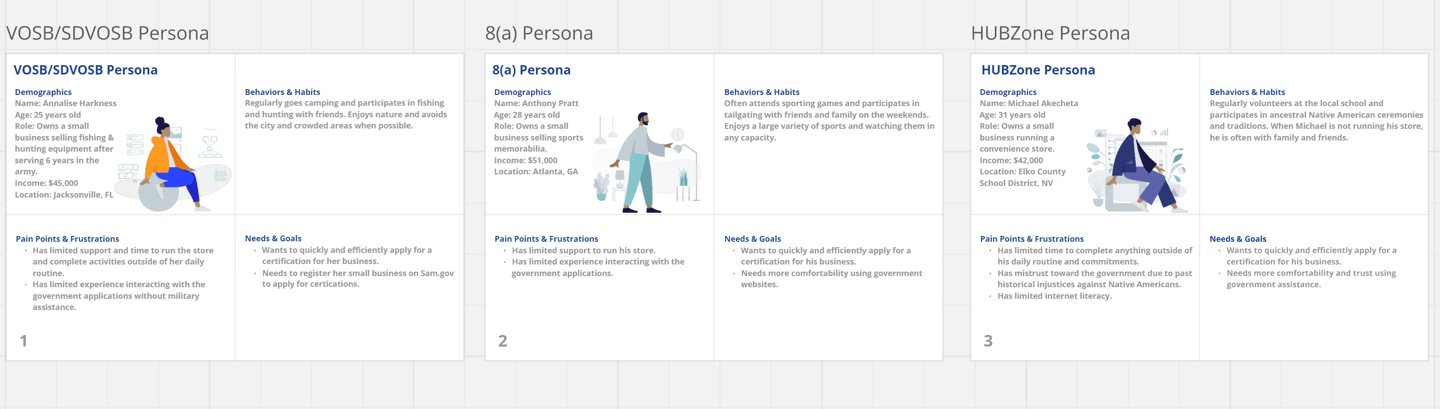 Below are five user personas developed for the MySBA Certifications portal. These personas represent the primary users of each SBA certification program: Veteran-Owned Small Business (VOSB) / Service-Disabled Veteran-Owned Small Business (SDVOSB), 8(a) Business Development, HUBZone, Women-Owned Small Business (WOSB), and the All Small Mentor-Protégé Program. Creating these research-based personas was a critical first step in deeply understanding the SBA’s diverse target audience. They capture real users’ goals, motivations, challenges, and pain points, enabling us to design a more intuitive, user-centered MySBA Certifications experience and supporting platform that truly meets their needs.