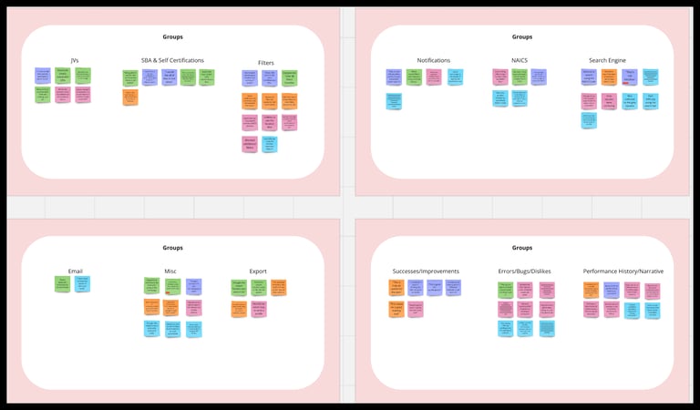 After the meetings, I was instructed by the UX lead to rewatch the usability tests which had been screen-recorded to allow for later analysis. While doing this I created an affinity diagram as my first method to synthesize the data gathered. I assigned each participant their own sticky note color and took note of which tasks perplexed users, which tasks were completed with ease, comments and quotes that stood out, and any other significant behaviors. Once I completed my sticky notes, I grouped them based on common themes for further analysis.