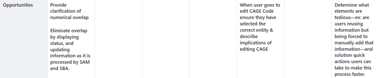 The following user journey map shows the first 7 steps of a SAM.gov external user. These steps are outlined by actions taken by the user, the tasks the user must complete, needs & pain points the user encountered, and opportunities recognized by the team to improve the user experience.